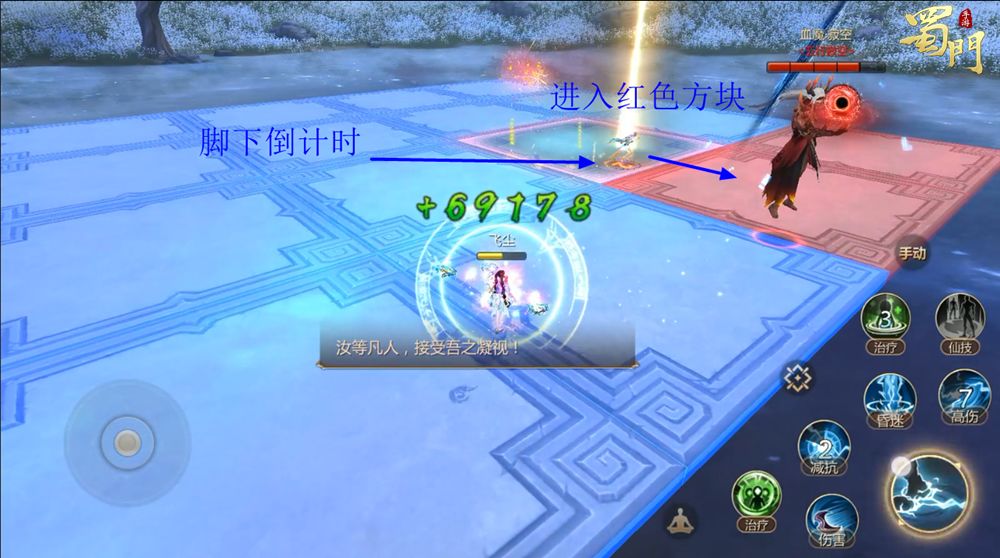 应对方法:这个技能一般是由武尊处理,需要留意的是,这个技能会使两个方块变为破碎的红色,并且能随着走位而变换破碎方块的位置。武尊最好能将破碎的方块控制在场地边缘靠角落的位置,如果现在场地上已经有红色的破碎方块,应尽量走进红色方块内将破碎的方块叠加放置。点名结束后,再走到蓝色的安全方块中。