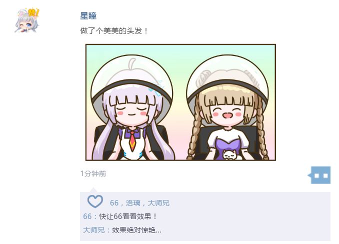 昨天,星瞳和洛璃一起体验了大师兄精心研制的顶级头发,发了条票圈留作纪念...1