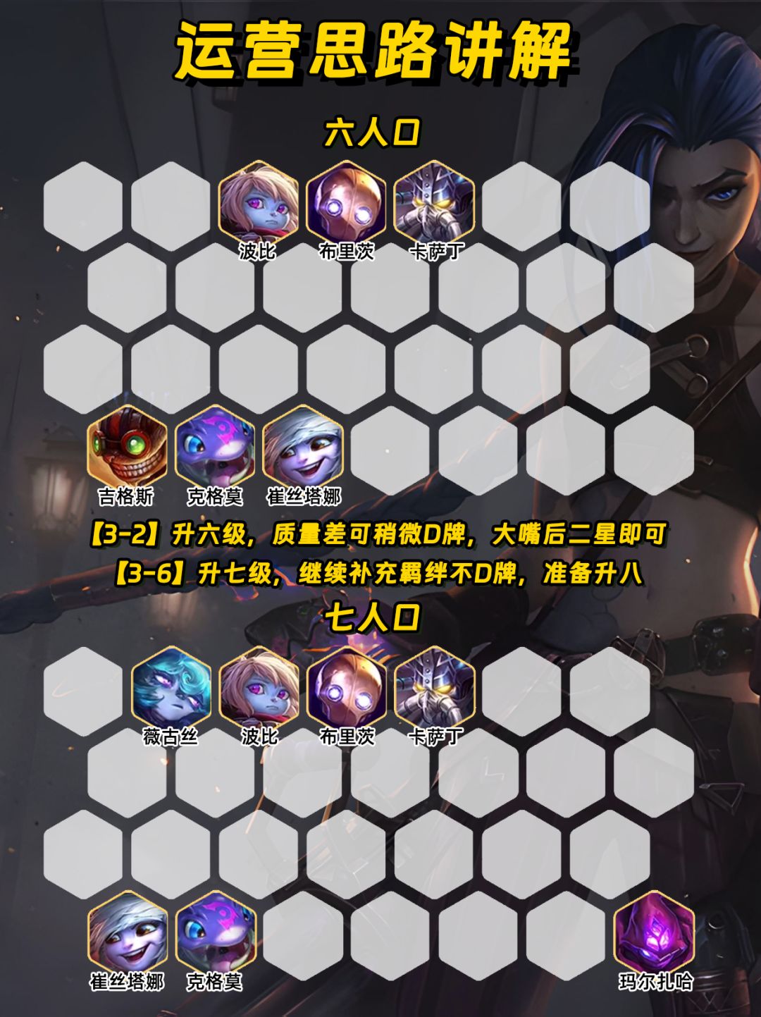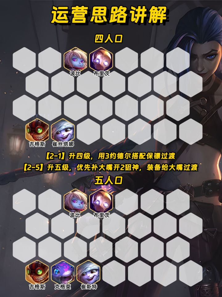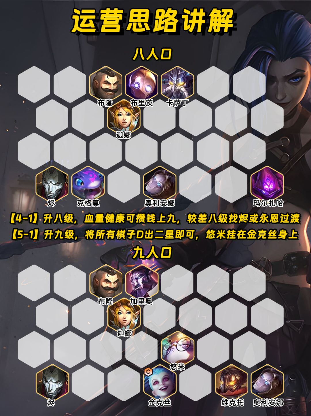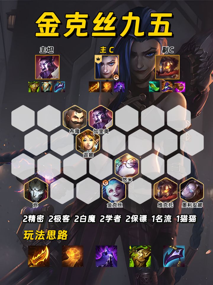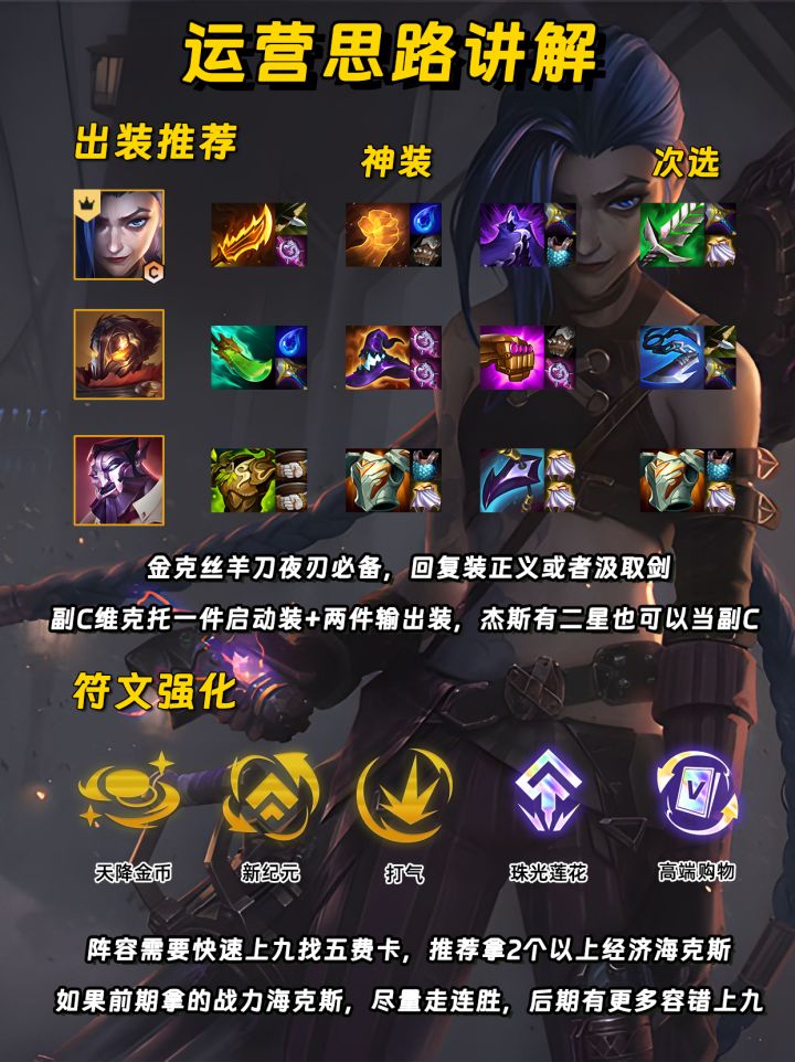 阵容需要上九找五费卡,推荐多拿经济类强化,如果前期连胜较多也可以考虑。