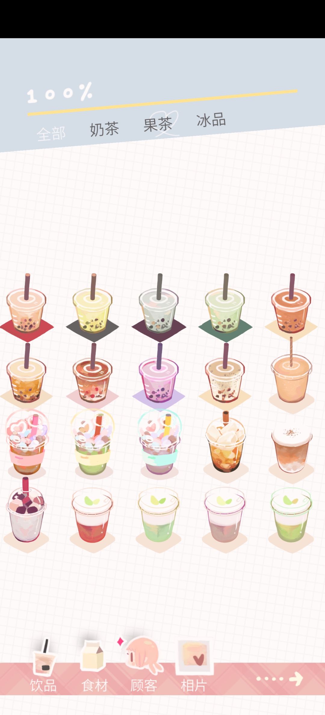 终于解锁成功所有图标,但是对我这种收集癖来说食谱太少,太快就解锁完了,失去了继续玩下去的动力。另外想说金币抽食材,出茶叶的几率太高了吧,反而牛奶和水这种基础材料出现的数量反而比较少,后期奶茶升星好难,而且对我这种强迫症患者,储物柜里一波红茶绿茶难以消耗,看得我真的抓耳挠腮,好浪费啊!!!!