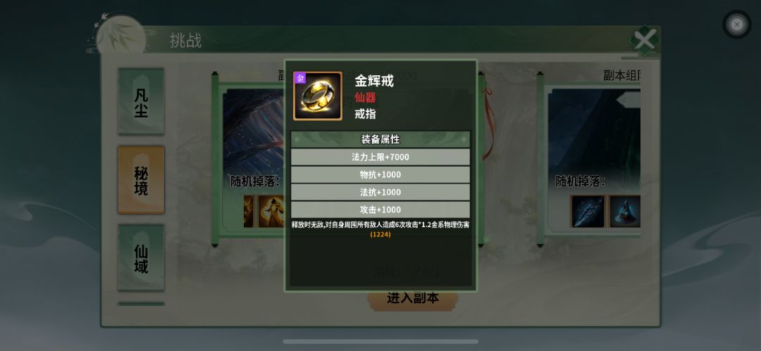 以上完成后,直接打秘境副本,风筝走位,慢一点都可以,直到打出金辉戒(无敌戒指),有了这个戒指就可以越阶打后面30万战力的副本了!!!
