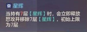 “星辉”是弈辰诸葛亮的核心buff,是跳脱传统怒气体系的新版“怒气”,弈辰诸葛亮依靠星辉来释放怒攻,其他技能组的几乎所有效果都是围绕星辉展开的,每7层星辉=1次弈辰诸葛亮的怒攻。