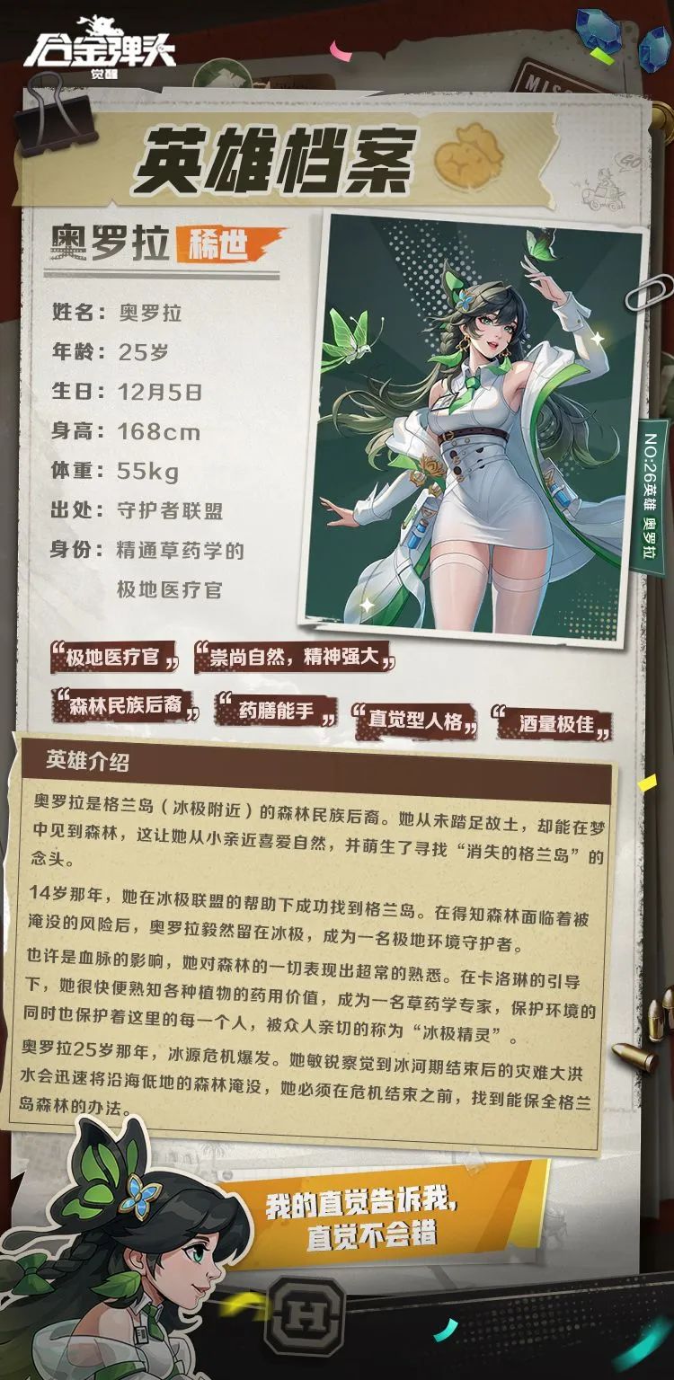 背景故事:奥罗拉是极寒之地的森林民族后裔,未曾涉足故土的她热爱自然,在长大后决心寻找消失的家乡。在重返故乡的土壤之后,她选择留下守护这片脆弱的森林,并通过自己精通草药学的优势守护自己的族群。面对来势汹汹的冰源危机,她能找到保全格兰岛森林的方法吗?