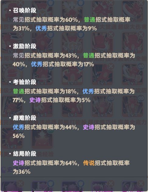 实测抽取1050次,统计结果如下。和官方公示概率大致一样,但高品质招式的概率会更高,可能是我太欧了![[嗒啦啦2_哈哈]](https://img.tapimg.com/market/images/1bbca193685a619674d8260ad0ed7455.gif)