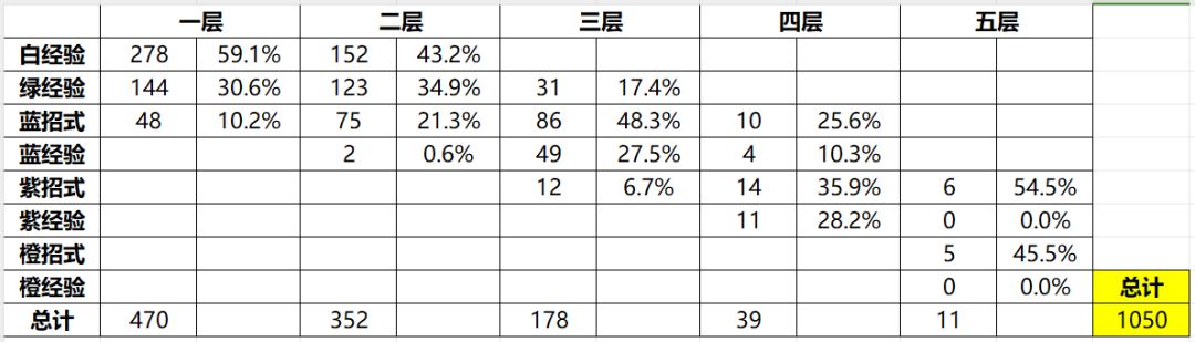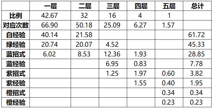 结合官方公示概率,平均957卢恩文字可到达1次第5层,约2657卢恩文字可出一次橙色招式(含经验)。这次统计意外的没出现过橙色经验,根据前几层蓝紫色招式比例和我自己小号抽招式经验,推测橙色招式和经验比大概是1:1到2:1的区间,也就是平均3985-5314卢恩可获得1个橙色非经验招式。