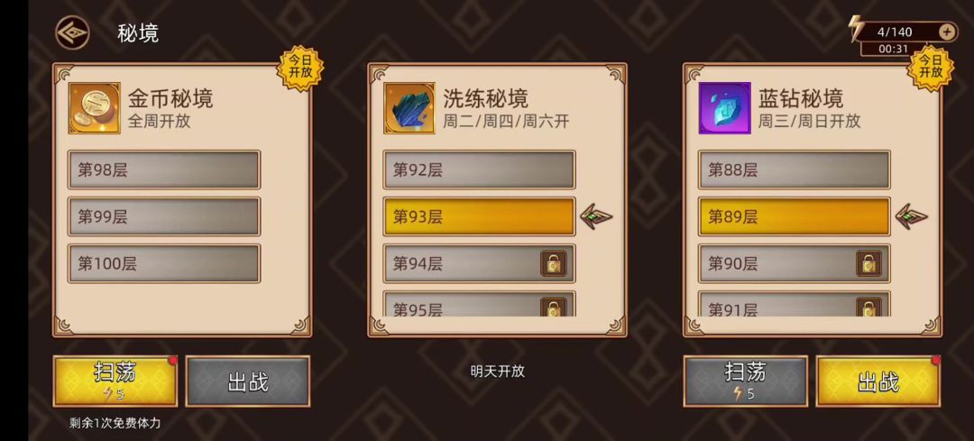 - 前期体力一定不要去花20体力去挂机扫荡。实在没地方花体力可以去每日活动、常驻副本刷本、主线打到最高后用6体力扫荡、秘境扫荡。 有一次免费的秘境扫荡不要忘了使用。秘境打到当前最高层开启扫荡。