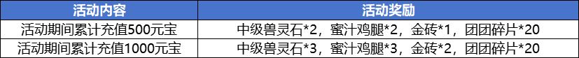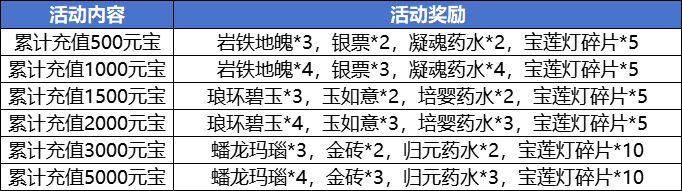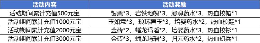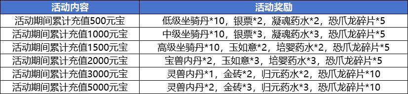 活动内容:活动期间累积充值元宝达到指定数额便能领取一份超值大礼包