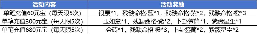 活动内容:活动期间单笔充值指定金额便能够领取一份超值大礼包。
