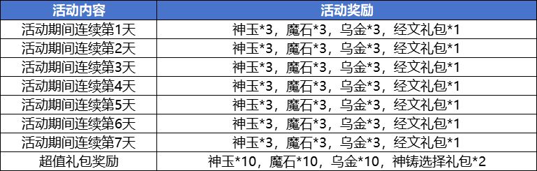 活动内容:活动期间累计充值达到指定金额便能够领取一份超值大礼包。