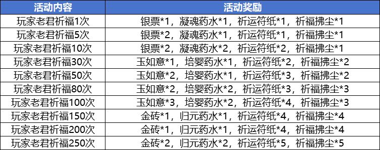 活动内容:活动期间累积老君祈福达到指定次数便能够领取一份超值大礼包