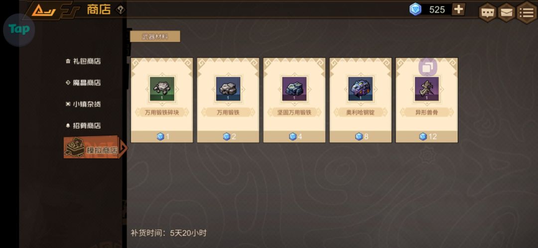 模拟商店:这个商店按需求兑换。因为做武器需要这些材料,消耗钻石和虚拟币兑换也是巨大。因为武器需要用钻石配合材料研究。