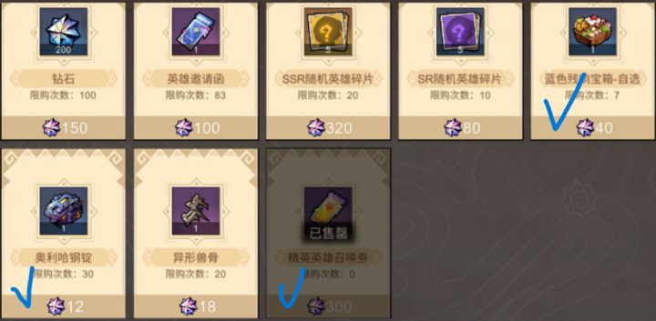 每周商品(图3)里打勾的推荐买,精英英雄召唤券可以获得一个sr或者ssr。蓝色残响自选可以快速得到想要的残响套装,便于前期战力成型,如果出战英雄残响已经全部齐全了,可以不买。至于矿石可以升级在工坊提升打造武器等级,看需求了,缺了就买。
