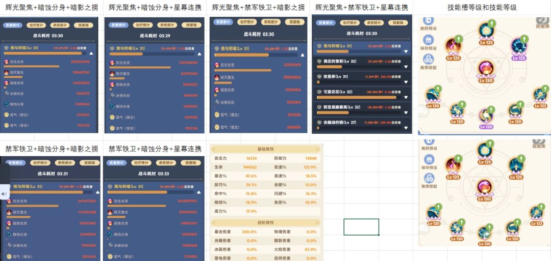 3. 初步结论:在二转技能120级后,核心技能紫色3星以上的前提下,如果暴击在45左右,技巧在35%左右,极速在18%左右,辉光+暗蚀+暗影可以作为较好的输出方案(而且我的暗影之拥和暗示分身还只是紫色的)