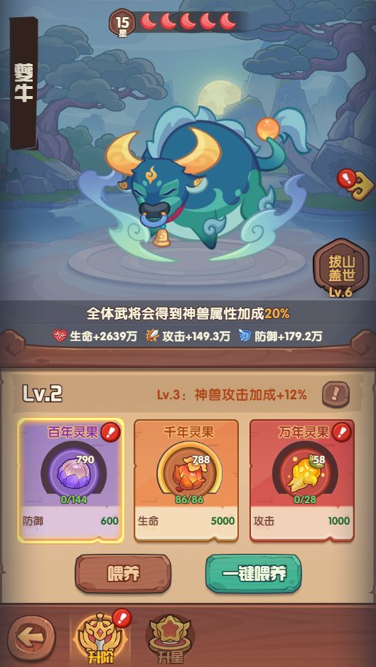 - 升阶可以增加相应的神兽属性,而神兽的20%属性可以在对战中增加在全体武将身上。