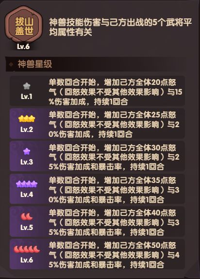 - 神兽的属性会按20%的比例继承到全体武将身上,增强整体战斗力。