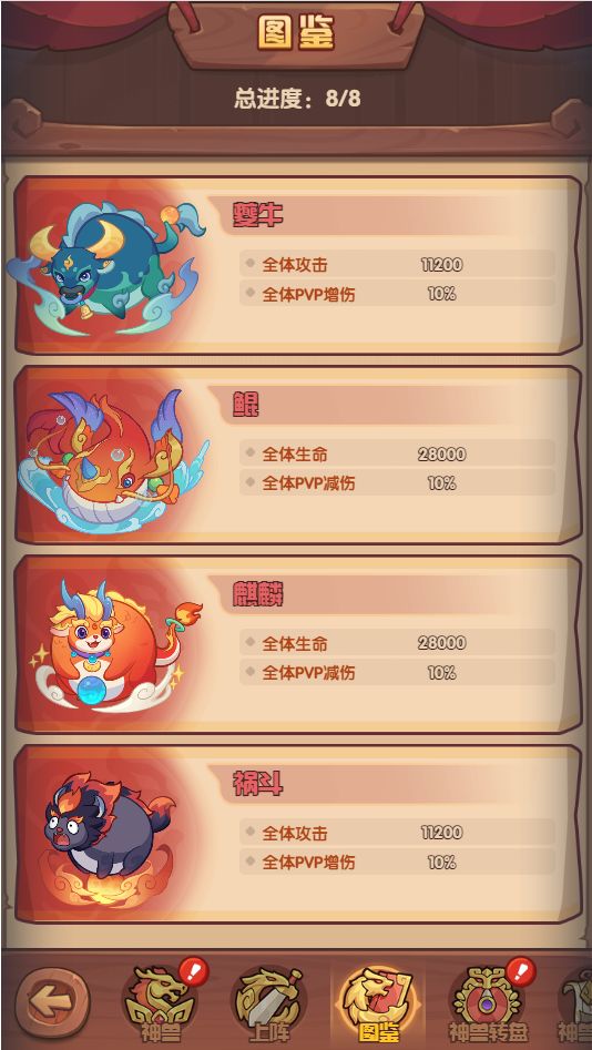 - 此外,每激活一个新的神兽,还能到神兽图鉴里进行解锁,获得大量的属性加成,此外更是有宝贵的pvp和pve加成。