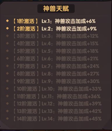- 此外每个神兽的神兽天赋偏向属性不同,推荐优先升阶攻击加成天赋的神兽,其次是生命, 最后是防御。