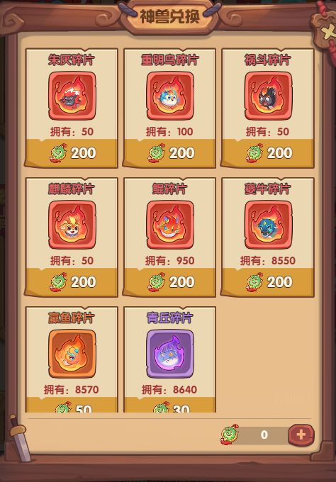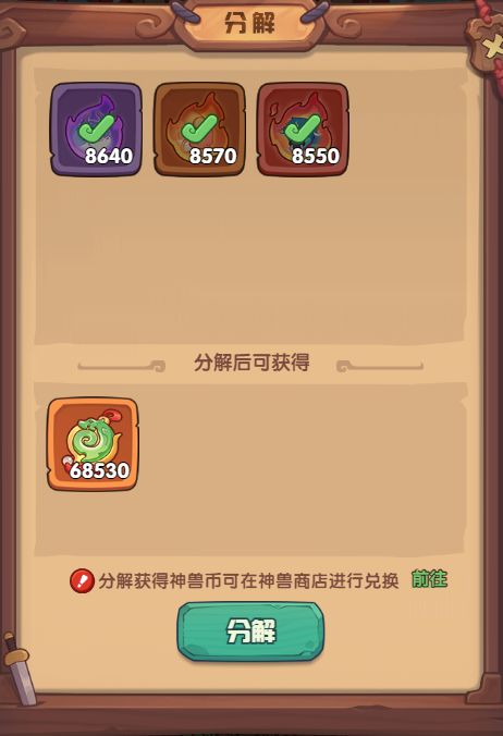 - 另外当神兽满星后,多余的神兽碎片可通过神兽回收功能进行分解,获得神兽灵佩道具到神兽兑换商店换取其他未满星神兽碎片。