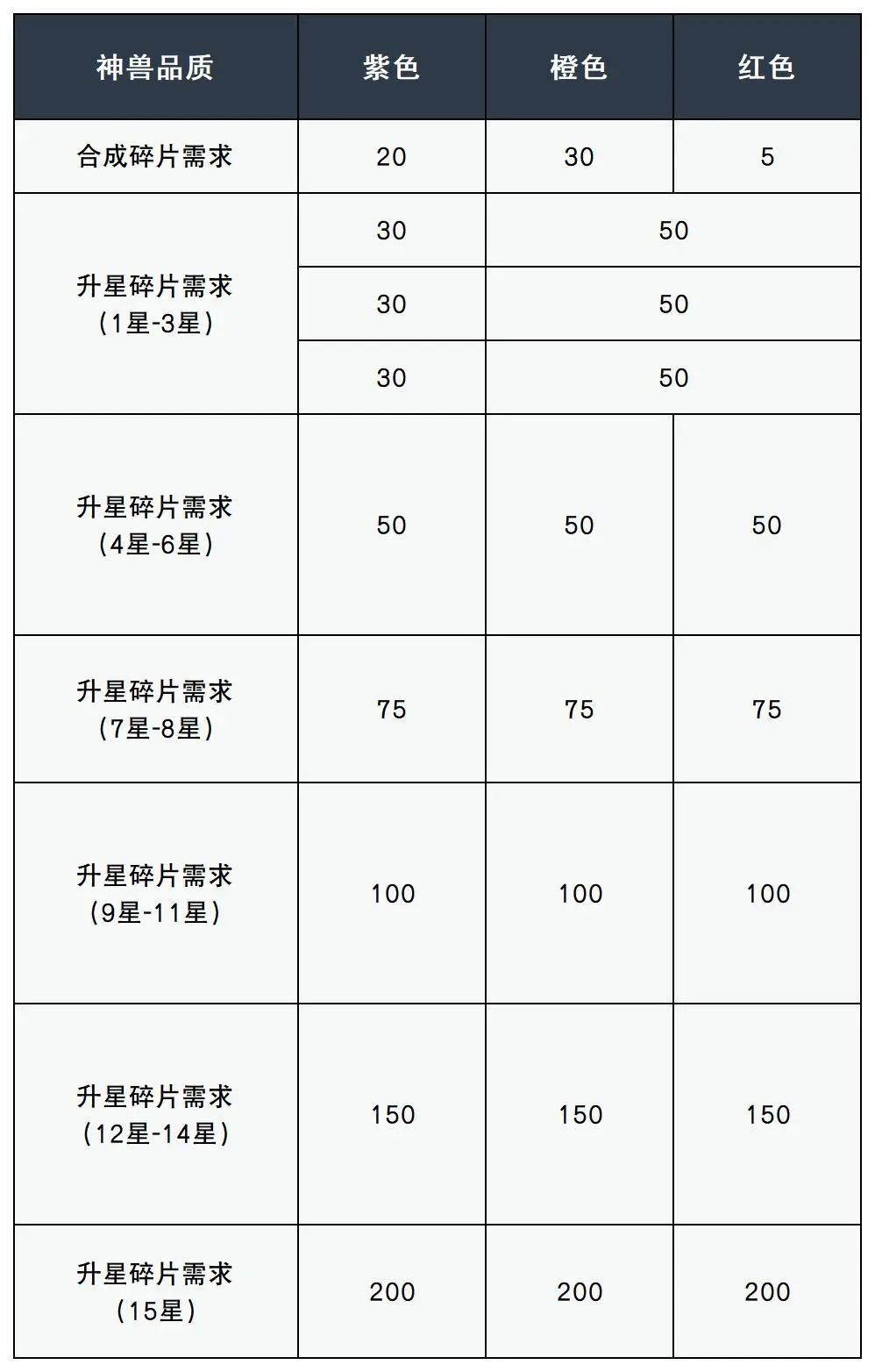 - 具体各品质神兽合成和升星碎片需求可看下表: