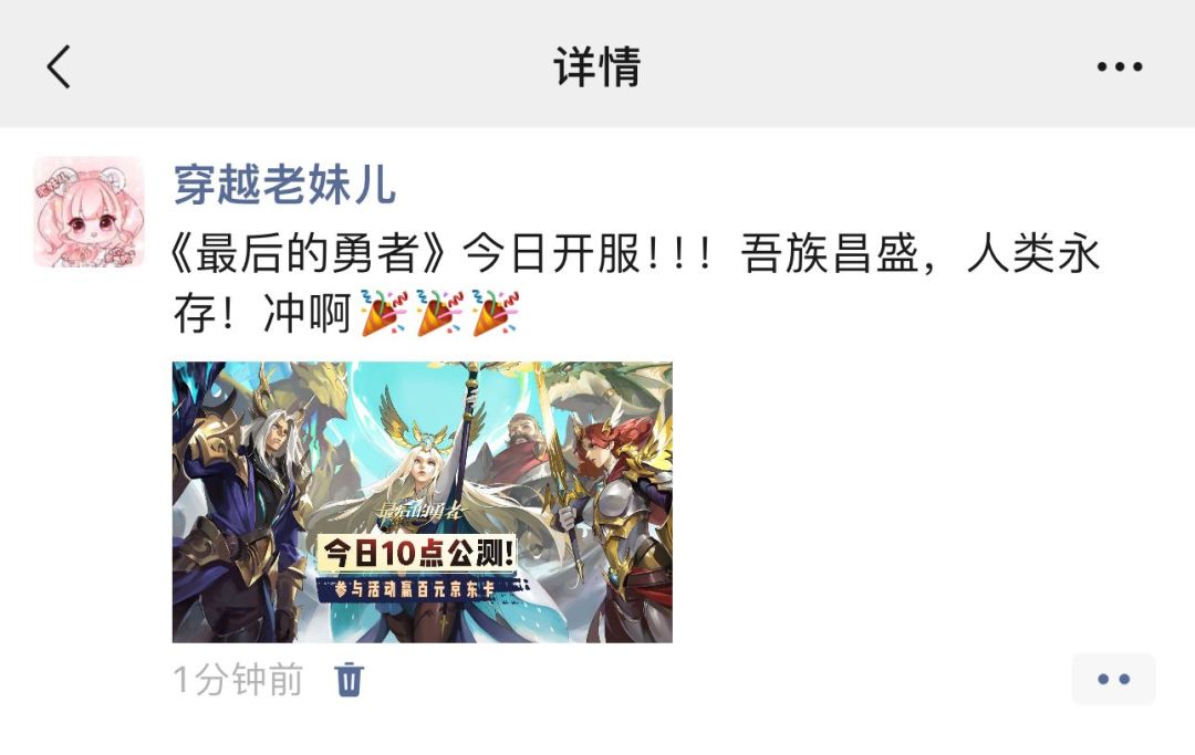 示例文案:《最后的勇者》今日开服吾族昌盛,人类永存!冲啊!!!