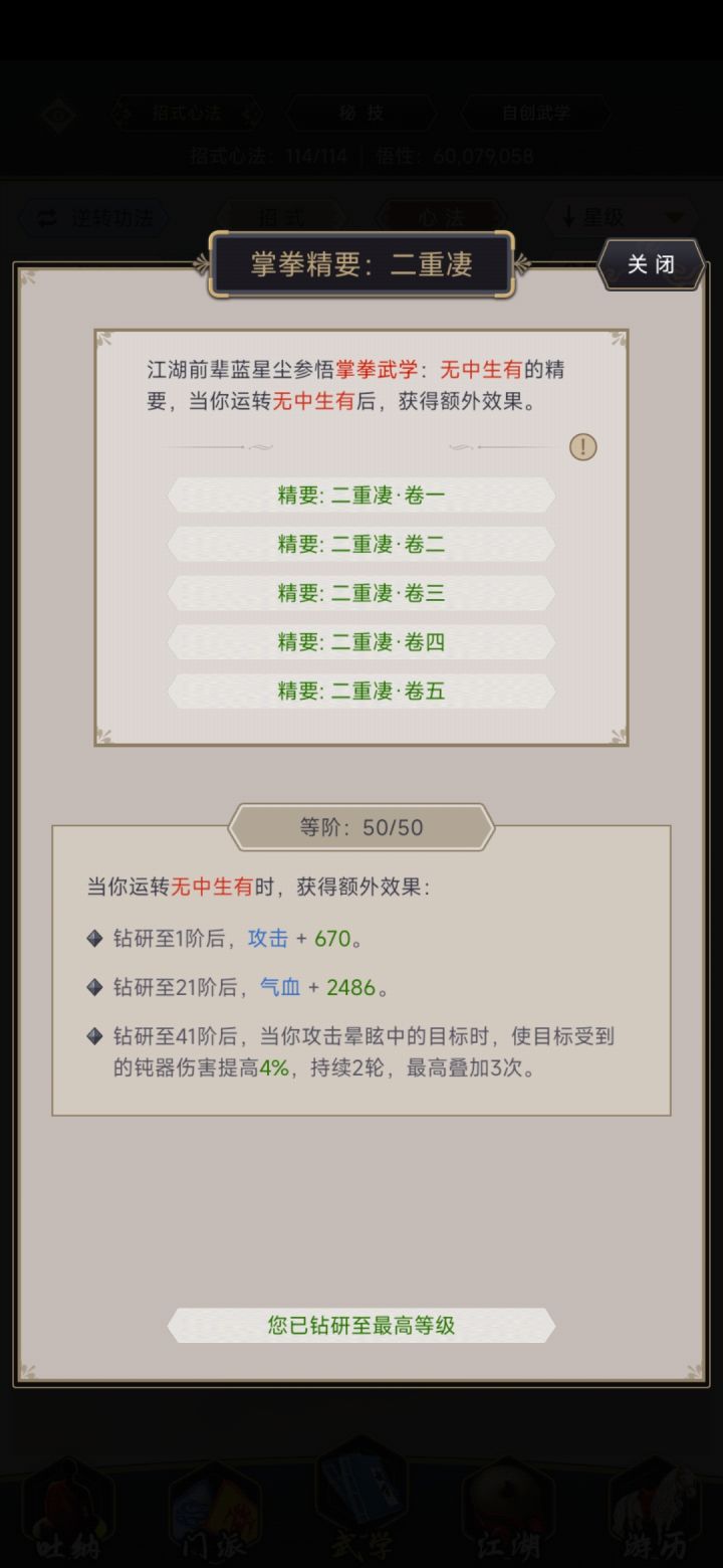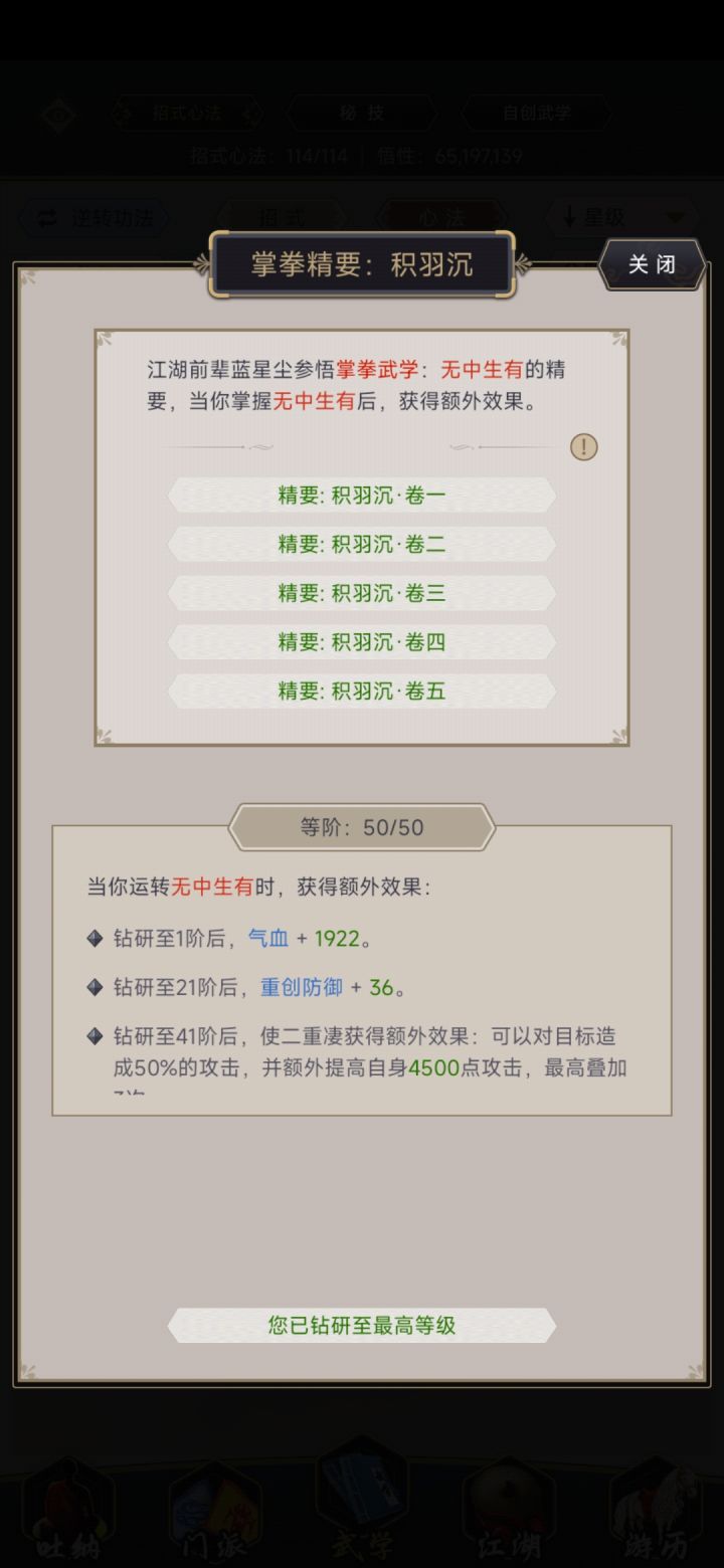 存钱准备明天三级地契,学习完命理丹术后去集市二楼买个推荐信去天煞盟挂机学武学,先学习横练太保、天决灭地手,日常任务及采购(同上),周四君山内场黄金买几颗气海丹,切磋升级武学(此处有时间的建议肝,开荒阶段武学熟练度升级只肝君山就够了,也可以不肝,影响不大),肝满行侠,修为六阶七,声望8.3万,推图暂停。