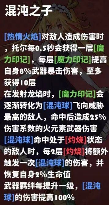混沌球视为武器伤害并且会随着武器羁绊等级提高而提高伤害敌人每带有两层灼烧还可以额外触发一次混沌球伤害并恢复生命值,混沌球伤害为女仆托尔的另一重要输出手段