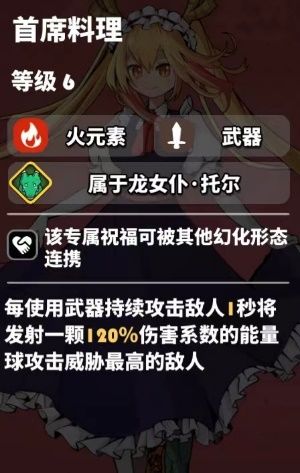 女仆托尔的专属祝福可激活五武器三火元素,在专属祝福中连携祝福首席料理的收益是非常低的在初始六祝福的环境中需要选择其余四个祝福加上两个武器附加伤害祝福,作为连携技能首席料理同样不能为其他幻化提供较高的收益,其他的幻化也不建议携带