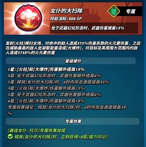 六星:魔力印记上限提高,消耗魔力印记后获得大量的攻速和火元素伤害加成,魔力印记上限的提高同时也意味着武器暴击伤害加成提高、混沌球发射数量提高,该星级大幅度提高了女仆托尔的伤害,是所有星级中提升最大的,使其强度有了质的提升