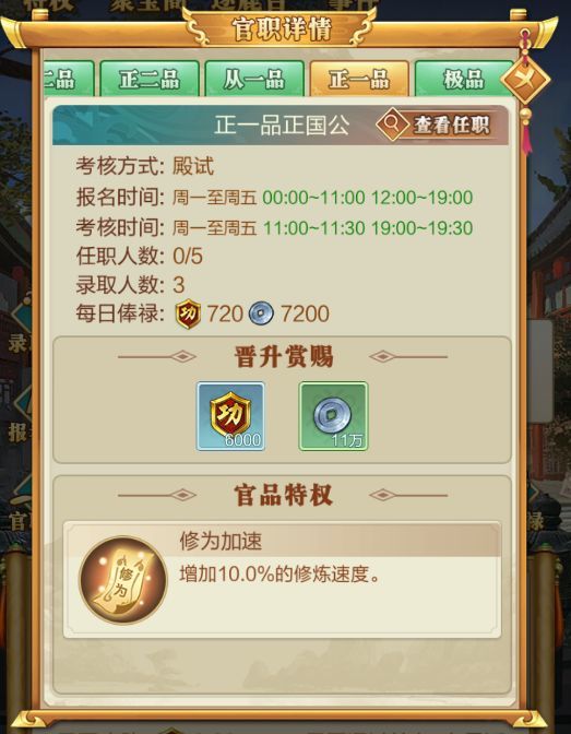 2、提升官品 官品可百分比提高基础修炼速度。
