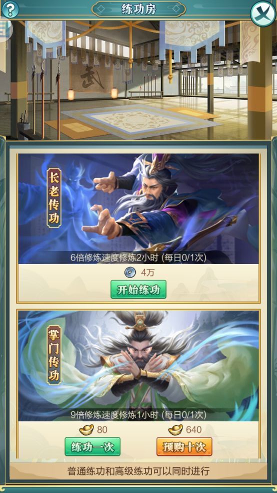 门派修炼分为弟子练功(6倍修炼速度修炼1小时)、长老传功(6倍修炼速度修炼2小时)、掌门传功(9倍修炼速度修炼1小时)三种。弟子练功和长老传功共享修炼次数,每日1次,只能选择其中1中,用银两开启修炼。掌门传功每日1次,用元宝开启修炼。