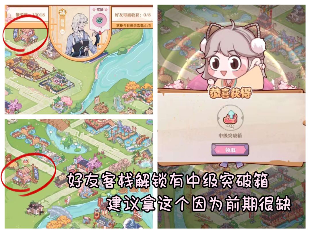 11.好友大地图能收东西,一天收五次,可以同个好友,相同建筑条件下好友装饰值高的建筑奖励会相对高一些,建议前期拿客栈中级突破箱。(补:很多人有bug拿的中级突破到背包变成高级突破)