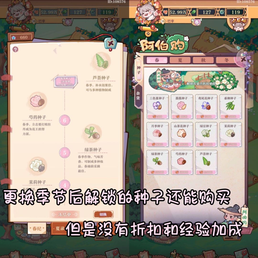 4.种地可以先换季节,但是如果已经解锁种子攻略就别换了,先把现有季节升满,把种子囤够再更换季节(补:更换季节种子不打折但是还能买,关于种地和季节切换有新帖拓展解释);
