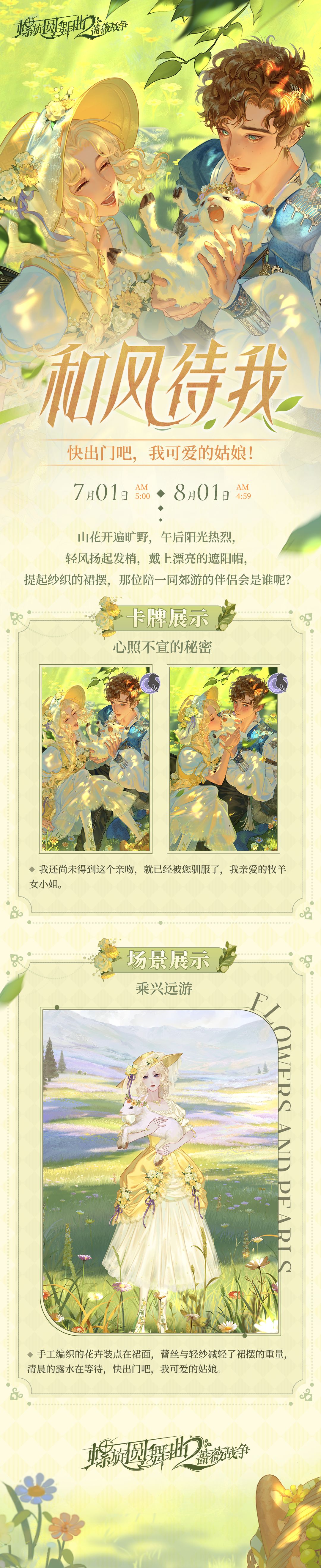 7月1日5:00-8月1日4:59,点击主界面「抽奖」进入「午后牧场」奖池,使用「野餐篮」抽取活动限定套装【和风待我】、限定卡牌【心照不宣的秘密】。
