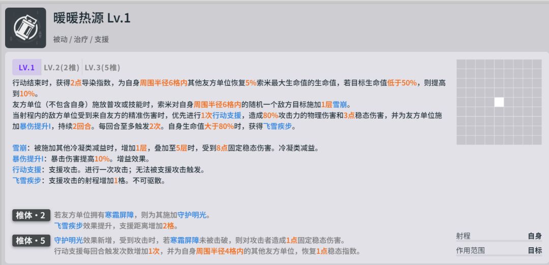 友方单位(不包含自身)施放普攻或技能时,索米对自身周围半径6格内的随机一个敌方目标施加1层雪崩。