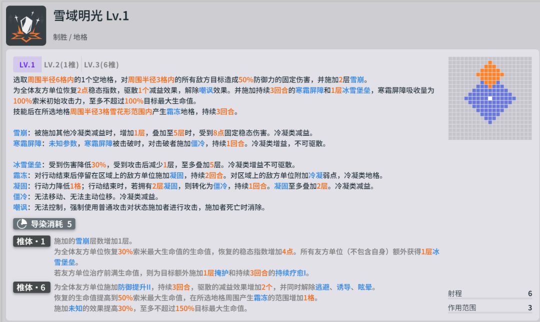选取周围半径6格内的1个空地格,对周围半径3格内的所有敌方目标造成50%防御力的固定伤害,并施加2层雪崩。