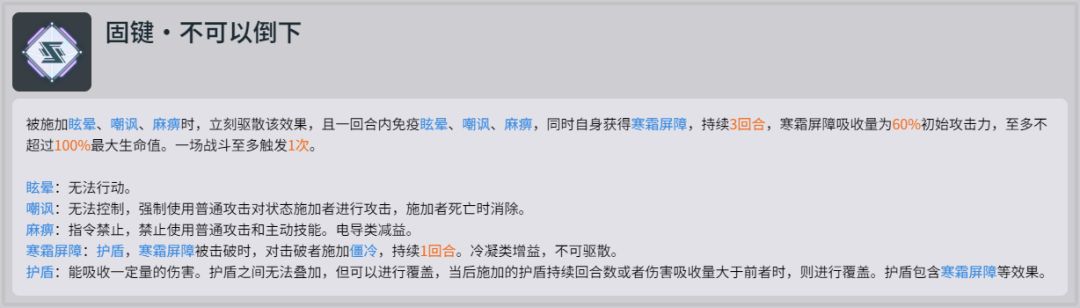 被施加眩晕、嘲讽、麻痹时,立刻驱散该效果,且一回合内免疫眩晕、嘲讽、麻痹,同时自身获得寒霜屏障,持续3回合,寒霜屏障吸收量为60%初始攻击力,至多不超过100%最大生命值。一场战斗至多触发1次。对策用,一般用在boss战