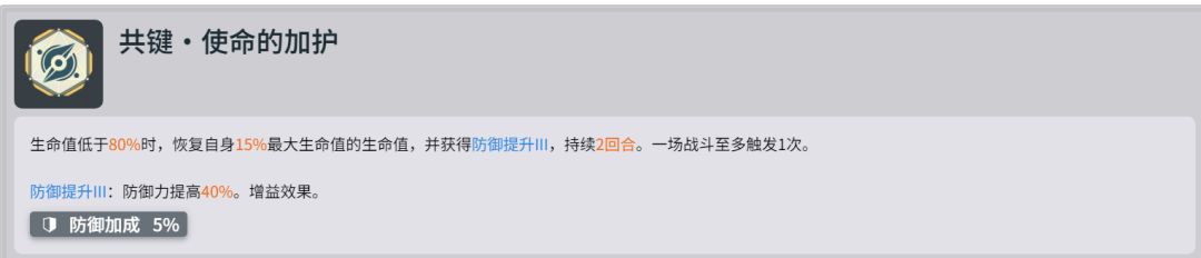 生命值低于80%时,恢复自身15%最大生命值的生命值,并获得防御提升III,持续2回合。一场战斗至多触发1次。这个看你是否用索米当主T,如果用肥霰主t给肥霰。