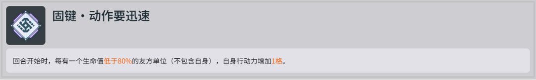 回合开始时,每有一个生命值低于80%的友方单位(不包含自身),自身行动力增加1格。一般没啥用,凑数的。