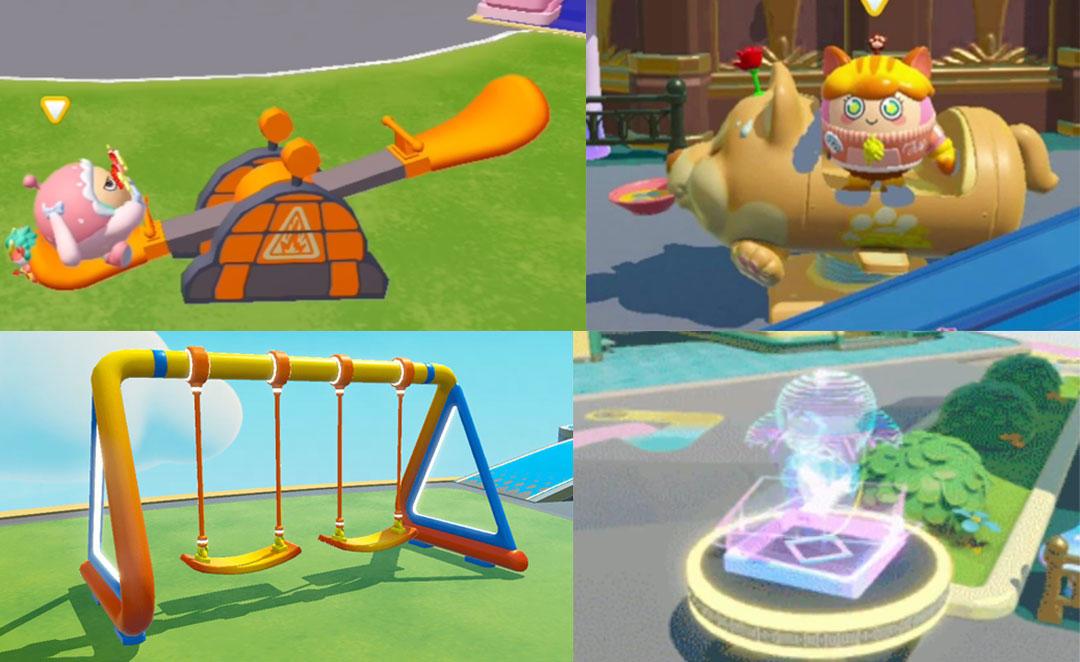 周边的四个娱乐设施,同样在平行时空的蛋仔岛上出现或曾经出现。红色地雷跷跷板的外形和地雷道具一模一样,让蛋仔紧张的心如跷跷板一样起伏难平;秋千可以荡得很高很高,甚至荡出彩虹拖尾的绚酷特效;还有可爱的狗狗摇摇车与传送蹦床,都是一比一复刻,是不是唤醒了岛主们不少温暖的回忆?