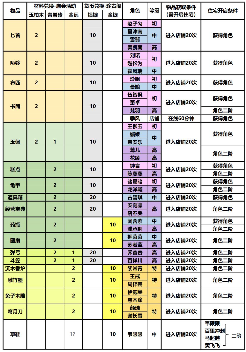 tips:表格内还列出了相应物品在珍古阁的兑换情况,珍古阁的银锭除物品外还可以用初/中/高级角色碎片、种菜产出等进行兑换,相应物品在珍古阁的兑换性价比不高,可以放心换活动材料;