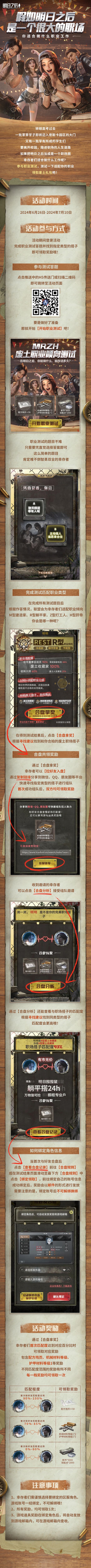 即日起至7月10日,幸存者们可前往活动页面参与职业测试,凭直觉完成简单的6道选择题,即可测试你的废土职业倾向!寻找好友组成废土职场搭子,还能领取职场奖励。