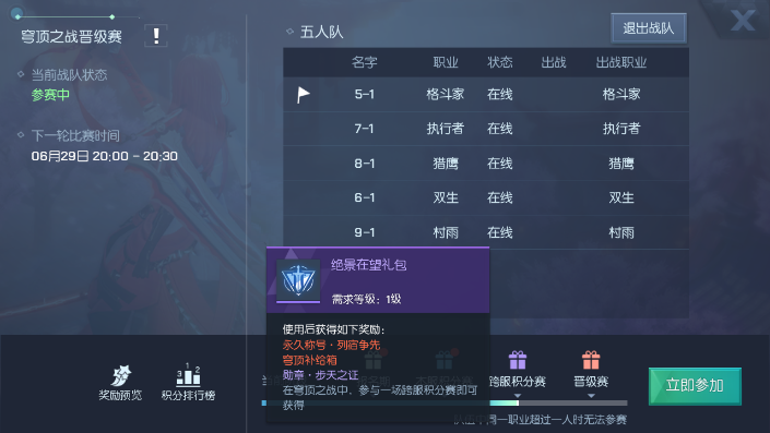 本服积分赛中排名前40的战队,战队成员≥3人且队伍中同职业不超过1人的战队成员可组队在6月29日20:00~20:30、6月30日20:00~20:30、7月6日20:00~20:30、7月7日20:00~20:30进行跨服积分赛的征战。跨服积分赛结束后排行前72的战队可成功晋级下一阶段。
