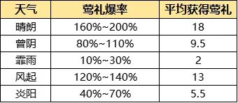 每日天气为随机,不同天气对应获得莺礼概率如下: