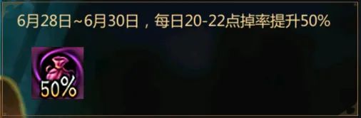 6月28日~6月30日,每晚20:00-21:59期间,掉率提升50%,仙术师们速速掐点上线,抢跑在刷掉落第一线吧!