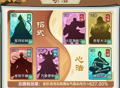 功法搭配方面此套阵容要求不高,只要有吸血功法-吞星大法即可,其余心法可以根据自身情况搭配。