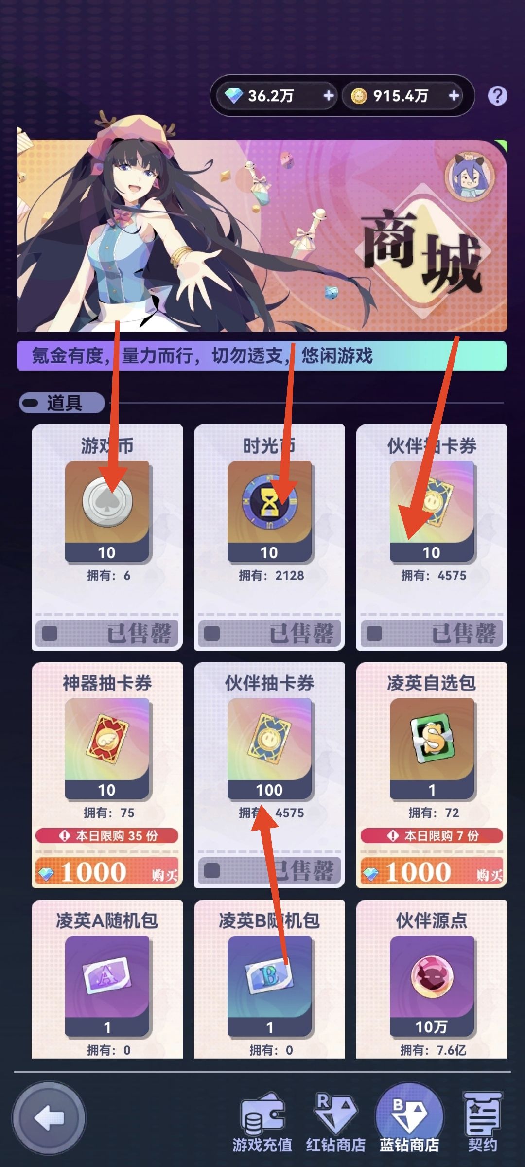 1.游戏币、时光币必买,当前版本核心玩法是投币子,这两个性价比超高。2.五折伙伴抽卡券必买,想打pvp,伙伴要多抽,底子要打好。3.虹彩前期优先购买,伙伴升星使用。4.高级选召券必买,尽早合成幻古领袖,推图和统领者天梯很需要领袖加成。5.神殿源点必买,升神殿400要许多源点,放心买,前100天不会溢出。6.普通命石、变异命石必买,命石凑连携帮助提升战力,下面会推荐相关命石。现版本钻石比较充足,所以推荐必买项较多。微氪玩家红钻商店推荐购买的礼包已在上个动态中提到,不再赘述。