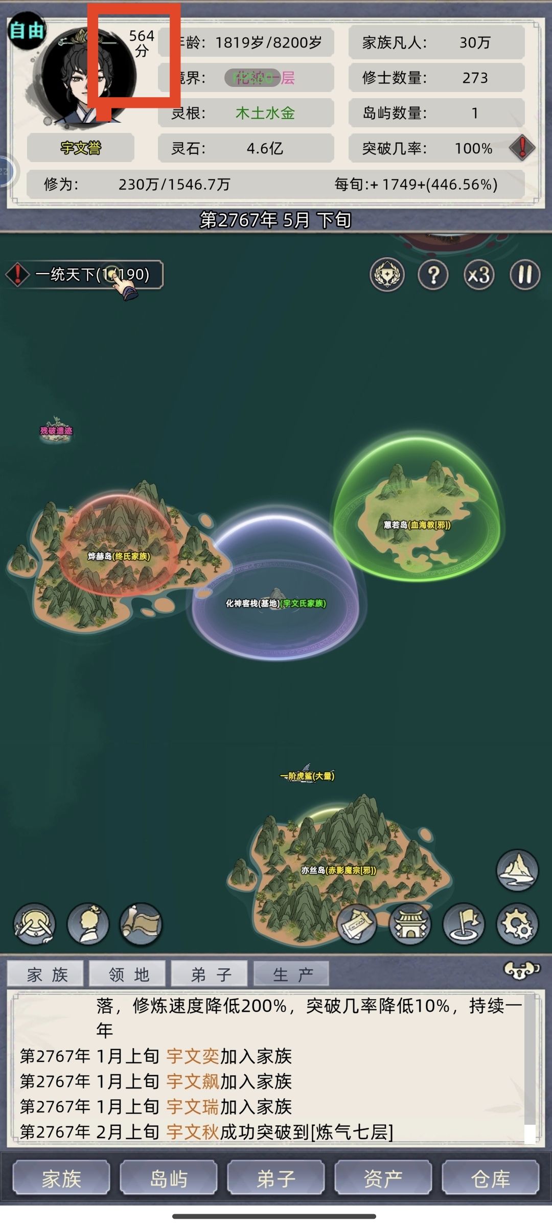做好商店预购,把灵石转化为丹药装备。特别要设九龙丹,福佑草九龙草和它们的种子!有种子马上种,它们的田地优先升级。这些草都是家族底蕴。十分不建议配血脉,父30母50儿女一二十,我不配。