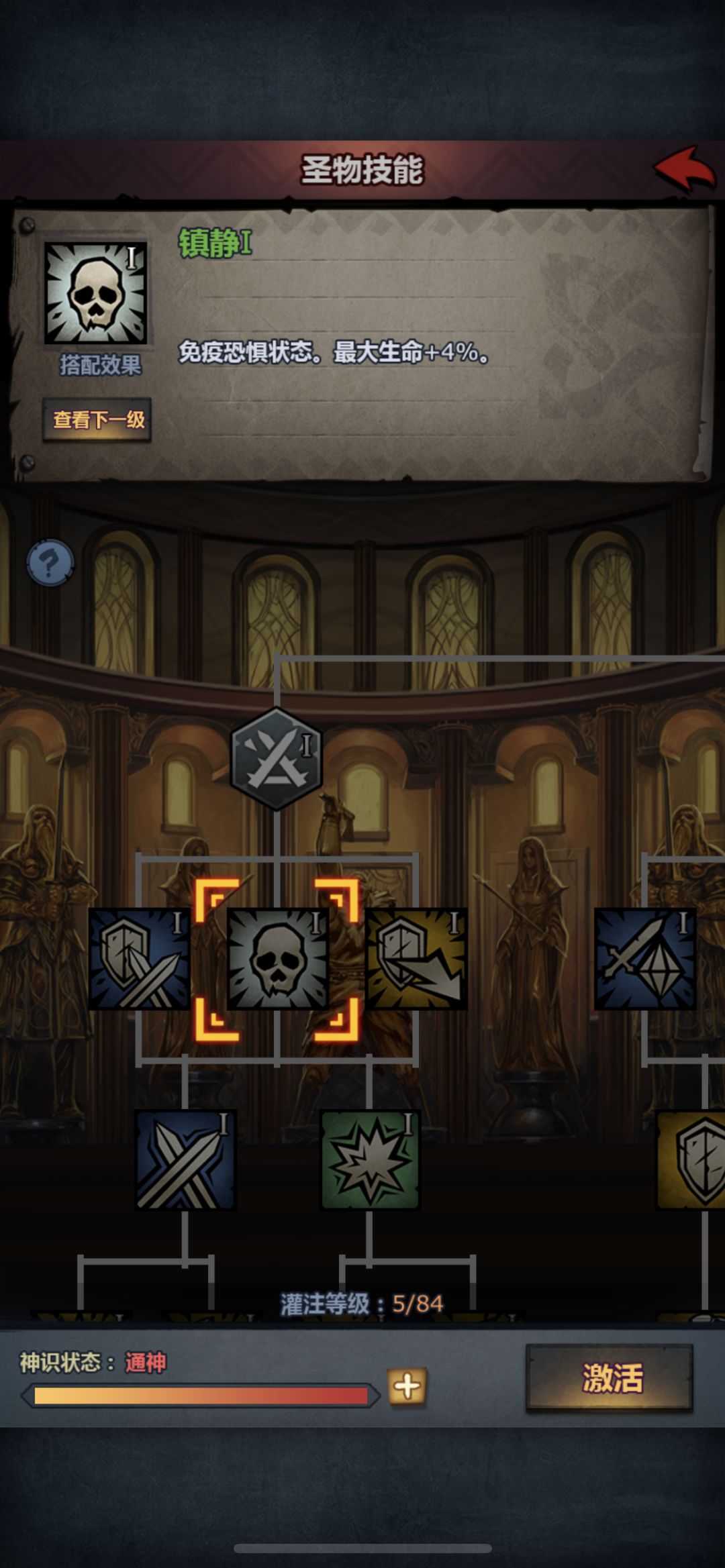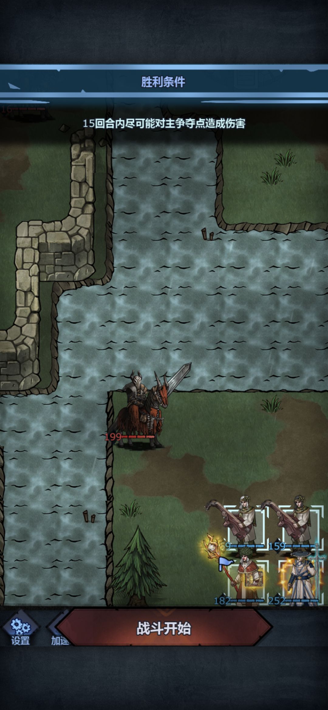 操作方法:开局雷主+主教+诗人集体向上走(顺带一雷打死贴脸的恐惧骑士,解锁当前区块的桥梁),物理c向右走,物理c走到正下方的桥梁塔下,普攻一下塔(会召唤3只恐惧骑士+3只狂战士),跳过回合让物理c挨揍,这里佩尔圣物的作用体现出来了:防止被恐惧骑士恐惧无法触发长虹,雷主队正常操作一路向上拆。