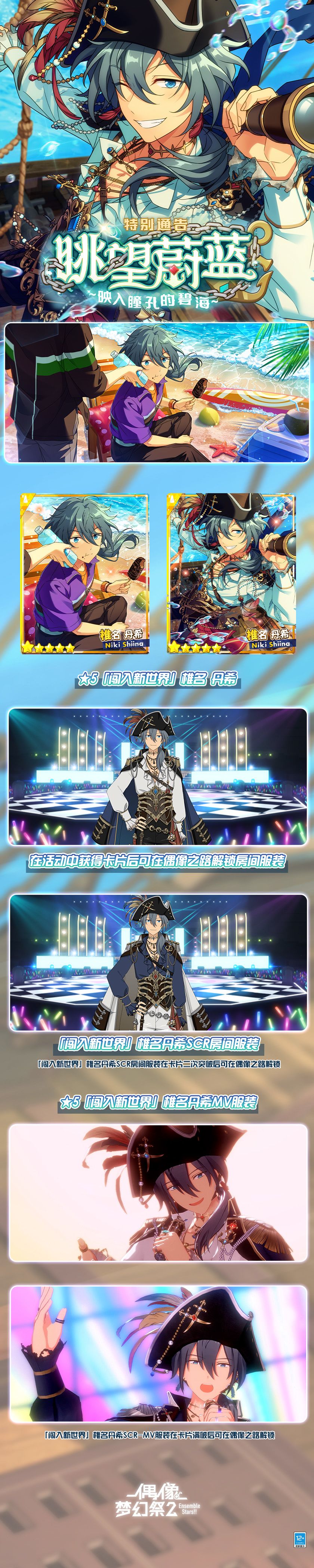 活动期间,游戏内将免费公开【特别通告 · 眺望蔚蓝】中所登场的偶像「椎名丹希」的相关联活动故事 ——「阳炎◆夏日余影与炽热极限」、「招募!甜甜觅觅」、「招募!甜甜渴望」、「美食对决/漂流?无人荒岛」