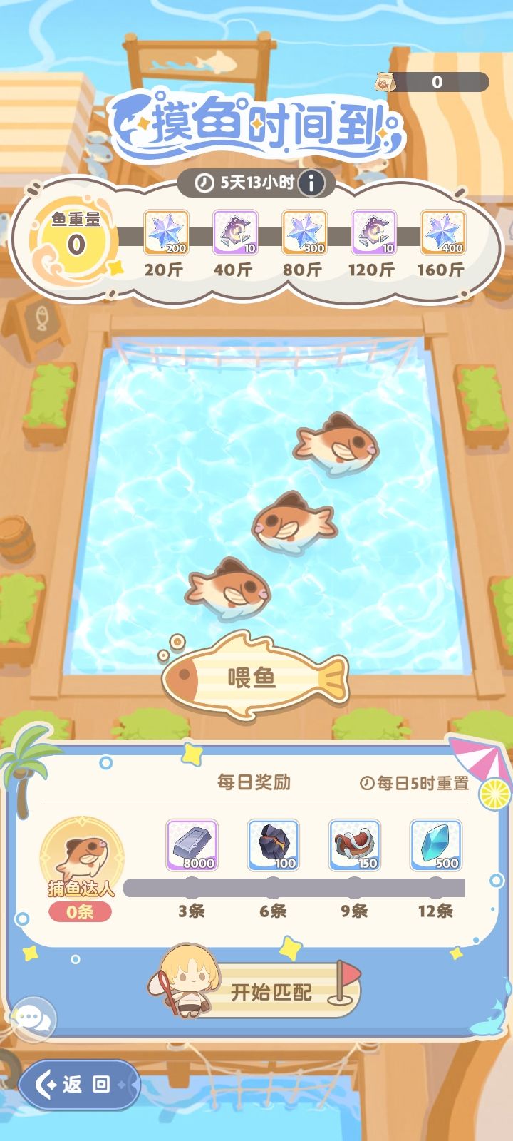 活动需要通过匹配对手,完成小游戏获取鱼,鱼的数量达到最下面的要求即可领取奖励,奖励内同时会附赠鱼食。